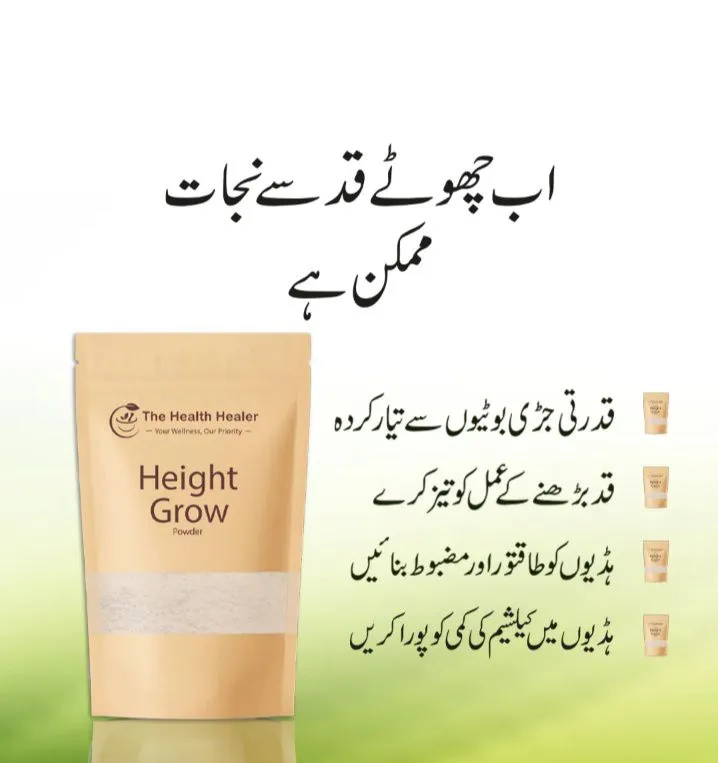 اپنی لمبائی کو قدرتی طریقے سے بڑھائیں ہمارے ہائیٹ گرو پاؤڈر کے ساتھ! یہ پاؤڈر قیمتی جڑی بوٹیوں اور ضروری غذائی اجزاء سے تیار کیا گیا ہے جو ہڈیوں کی نشونما، جوڑوں کو مضبوط بنانے اور مجموعی جسمانی ترقی میں مدد فراہم کرتا ہے۔ مرد و خواتین اور نوجوانوں کے لیے یکساں مفید، یہ پاؤڈر باقاعدہ استعمال سے قدرتی لمبائی بڑھانے میں مددگار ہے